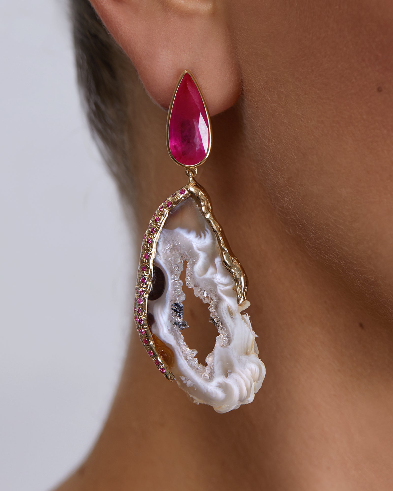 Embark on the enchanting journey of "Ruby Summer" Earrings, crafted from 14-Karat Yellow Gold. Featuring a 12.7-carat treated Ruby, delicate Ruby details, and White Agate slices, these earrings are a captivating tale of beauty. Secure them with the push-back butterfly, and let each wear be a chapter in your story of elegance and grace.