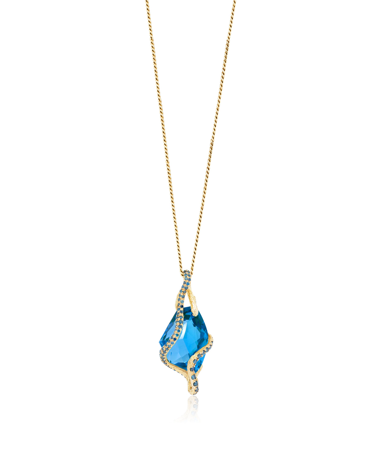 Inspired by a cool, inviting blue lake I glimpsed in Peru’s majestic Huaraz mountains on a blistering summer day, this London Blue Topaz is crown set into 18K yellow gold. Detailed with sparkling blue diamonds.
